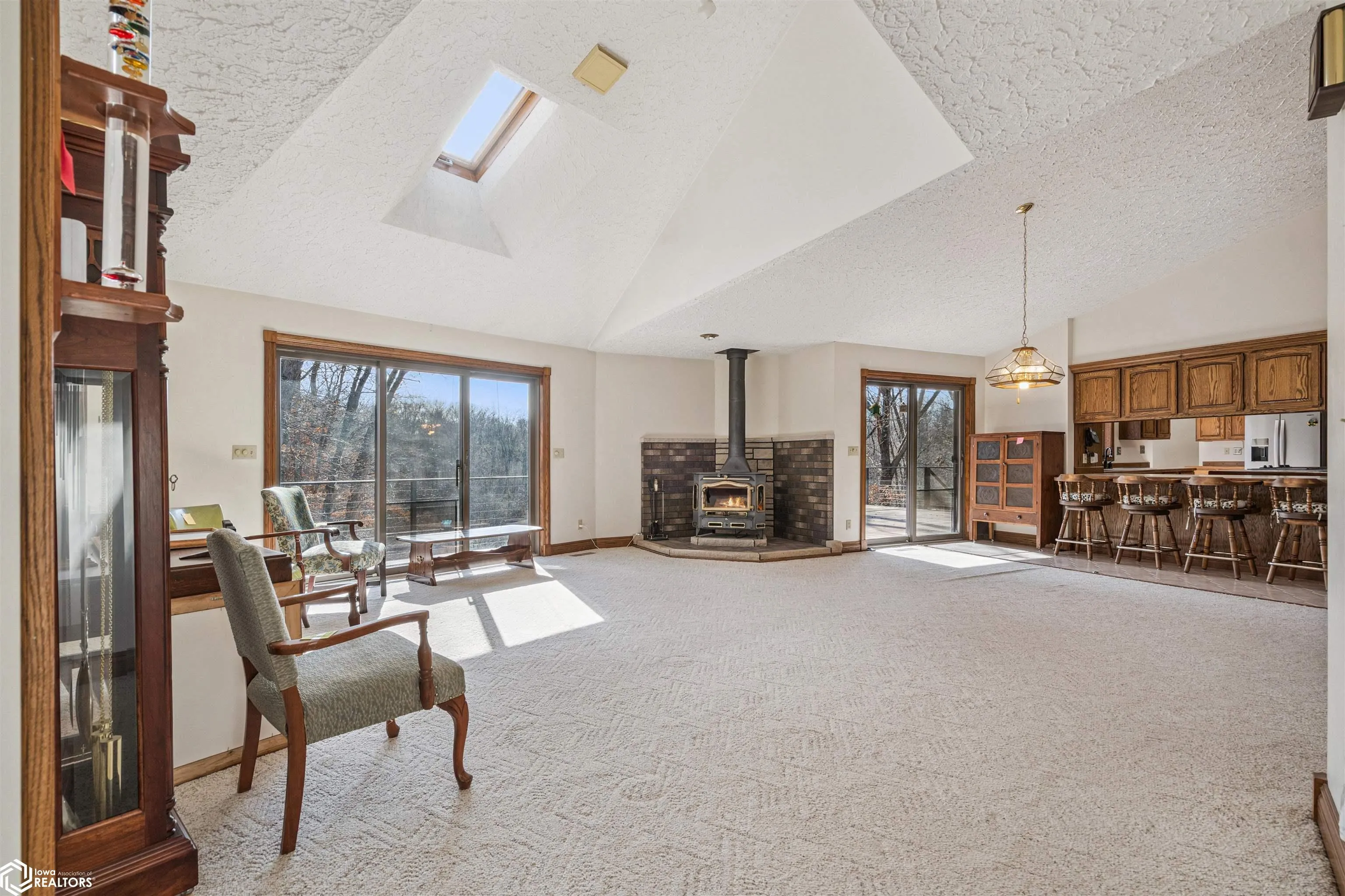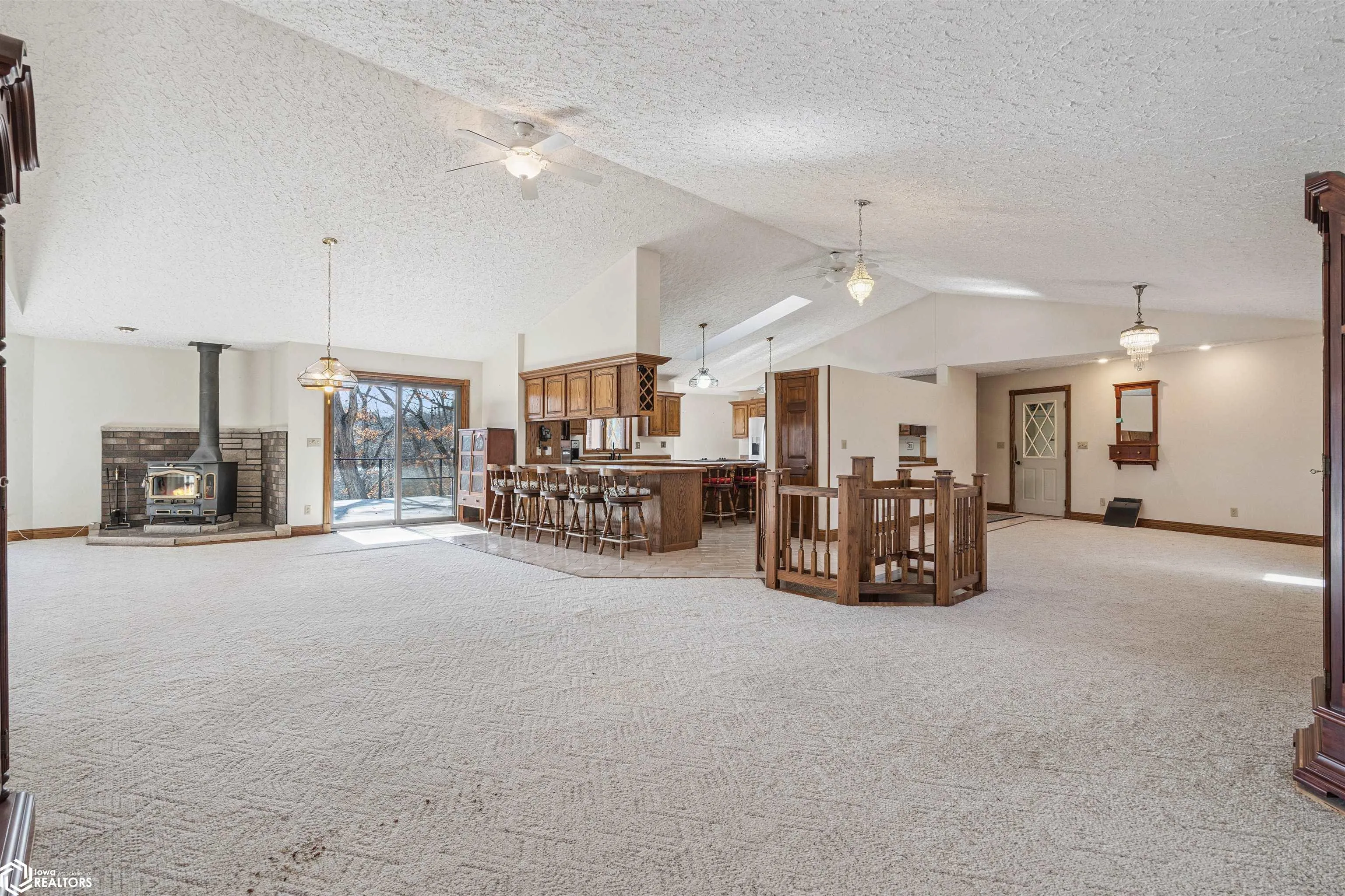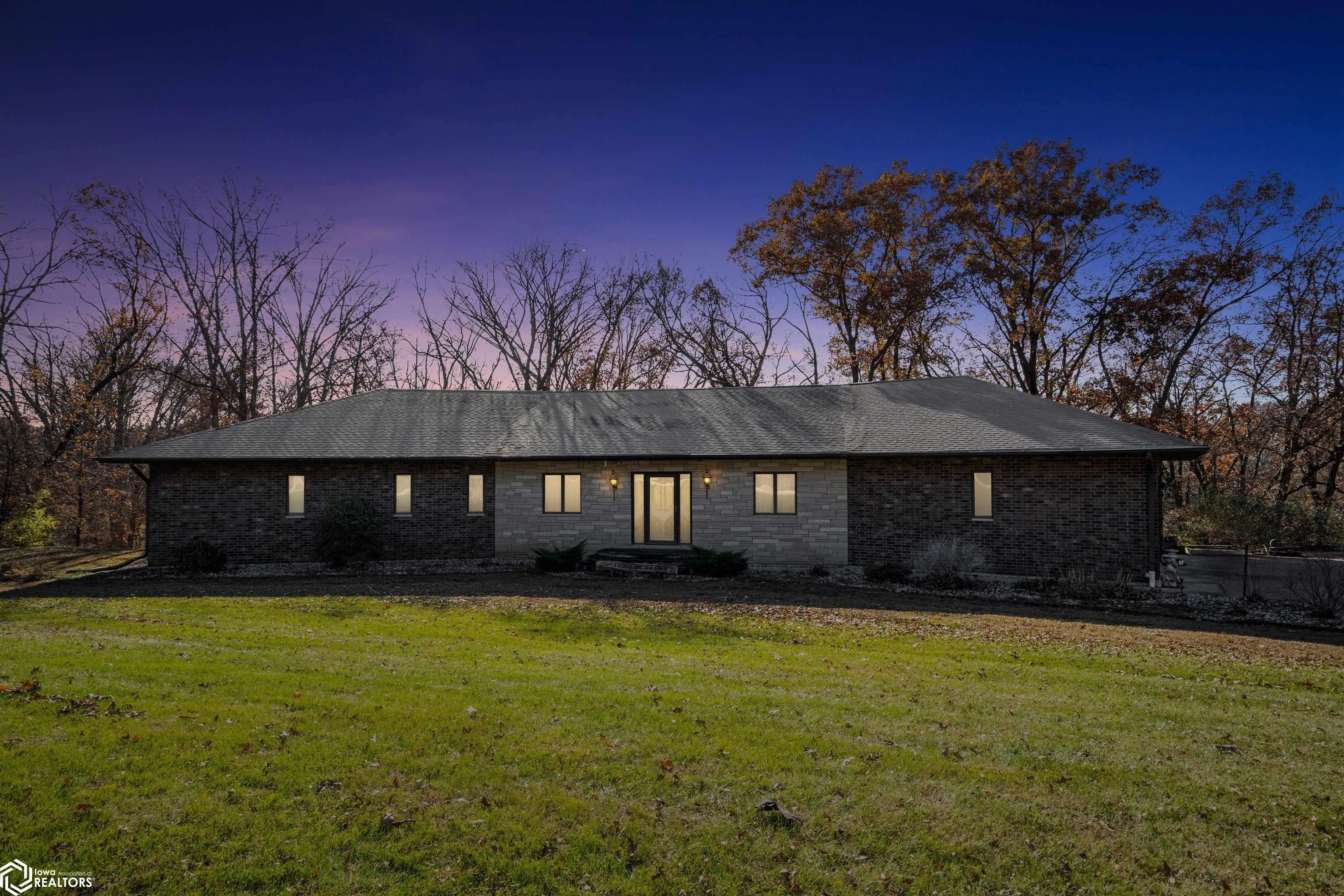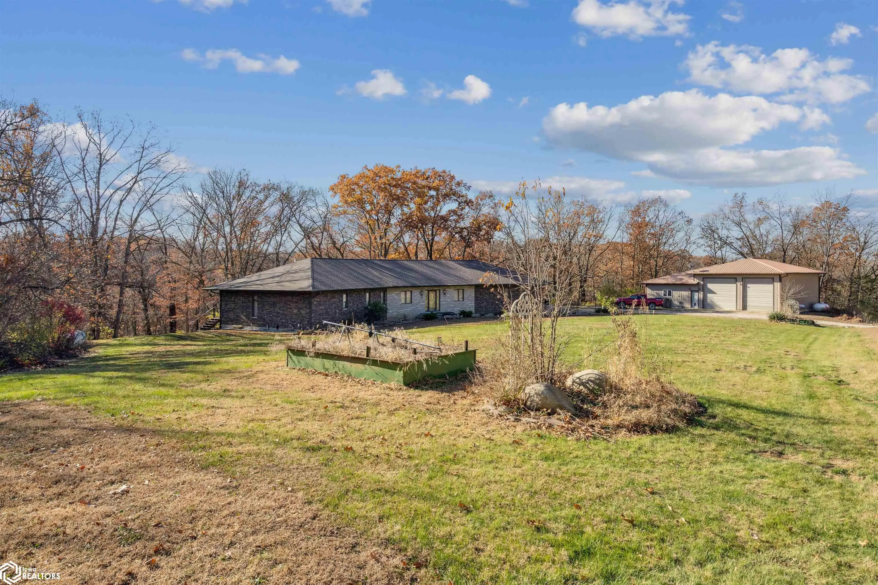 Tucked away on approximately 18 wooded acres in Danville, Iowa, this beautifully crafted, full brick exterior, ranch-style home offers privacy, quality construction, and exceptional versatility. Surrounded by natural views, the setting feels secluded while still providing the comfort of a thoughtfully designed home and an impressive shop building ready for work or play. The main level features an open-concept kitchen and living area with vaulted ceilings, skylights, and abundant natural light. Custom cabinets from Colorado, a large island, quality appliances, and generous storage make the kitchen both functional and inviting. The living room is anchored by a substantial wood-burning stove and opens to a composite deck with wire railings overlooking the peaceful back acreage. All of the woodwork and 6 panel doors are solid oak, that were hand finished by the original owner. The primary suite offers direct deck access, a spacious walk-in closet, and a unique vanity layout that adds both convenience & character. Additional bedrooms, baths, and an oversized laundry room complete the main level. The walkout lower level was built with strength in mind and provides expansive living space, a three-quarter bath, additional bedroom area, and massive storage. Unique historic-style glass doors add a one-of-a-kind touch rarely found in homes like this. A standout feature is the large shop with oversized doors and a loft, ideal for hobbies, equipment, or serious workspace needs.